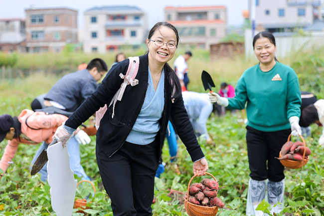 红薯田里,大家脸上洋溢着笑容,挖红薯的动作熟练,合作方老农人合作社在现场搭起烤箱,前几天刚采挖出来的红薯被烤得香甜软糯,香味满盈间,笑声与赞叹声交织,绿色田地里点缀着“西瓜红”,勾勒出农旅结合、乡村振兴的美好图景。
