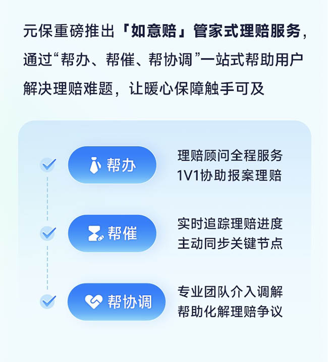为了提供广泛覆盖、保障有效的普惠保险服务,元保一方面针对不同人群定制产品,满足个性化保障需求,扩大普惠保险的覆盖面;另一方面对热销的主流产品持续创新升级,率先推出先进药械、“0免赔”、重疾康复津贴等保障责任,不断完善保障体系,让保障更周全,推动普惠保险质量迈上新台阶。此外,元保推出“如意赔”管家式理赔服务,通过“帮办、帮催、帮协调”三大机制,打造一站式理赔服务体系,在保障理赔效率的同时,提升理赔服务质量,为用户提供更高效、更温暖的理赔体验。