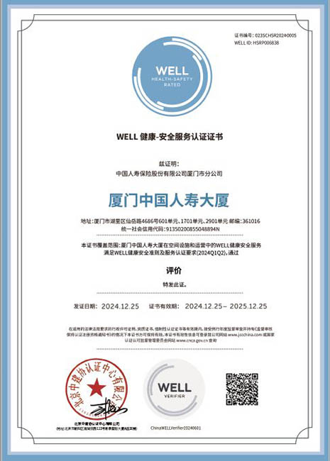 厦门中国人寿大厦通过WELL HSR认证