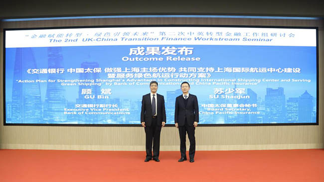 11月24日,中国太保联合交通银行在沪发布《做强上海主场优势支持上海国际航运中心建设暨服务绿色航运行动方案》(以下简称《行动方案》)。《行动方案》立足中国太保和交通银行的发展优势,聚焦“一个体系、四大能力”五大方面,提出二十项具体举措,主题明确、层次丰富,系统体现了中国太保发挥上海主场优势,做强绿色金融、深化促进业务融合,积极服务上海国际航运中心和国际金融中心建设的坚定承诺。中国人民银行研究局局长王信、上海市委金融办副主任陈继明、中英绿色金融工作组共同主席、伦敦金融城前市长Sir. Charles Bowman、英国驻华贸易副使节Sohail Shaikh、北京绿金院院长、中国金融学会绿色金融专委会主任、中英绿色金融工作组中方主席马俊等出席并见证,中国太保董事会秘书苏少军、交通银行副行长顾斌启动发布仪式,中国太保产险副总经理李超和交通银行授信管理部副总经理秦桦介绍《行动方案》相关内容。