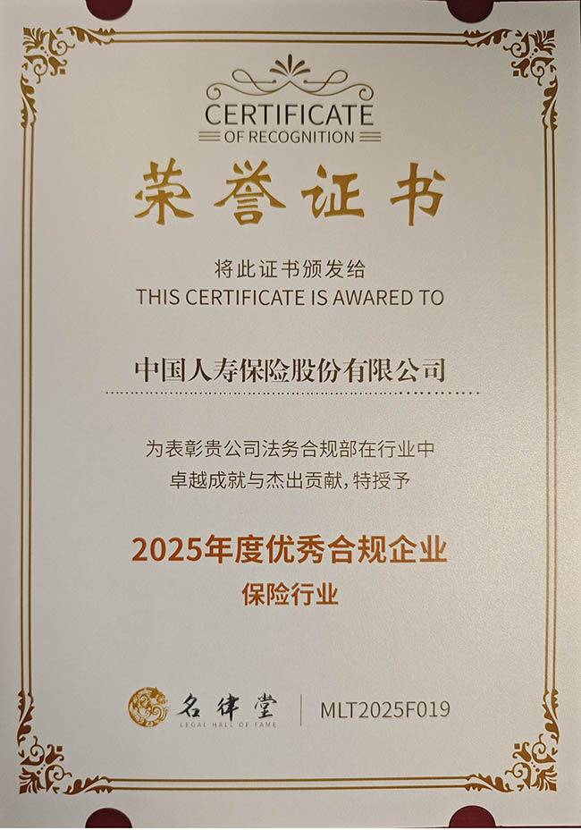 近日,在国内法律行业交流平台名律堂组织的“2025年企业合规先锋榜”评选项目中,中国人寿保险股份有限公司(以下简称“中国人寿”,股票代码:601628.SH,2628.HK)荣膺保险行业“2025年度优秀合规企业”。