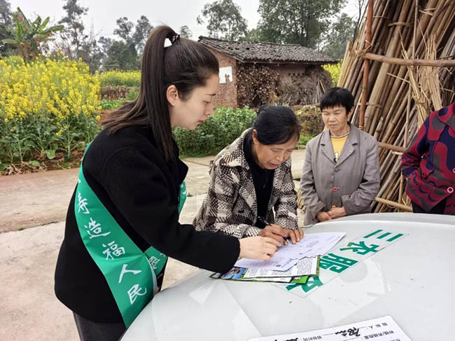 图说:油菜花保险承保下乡行动中,中国人寿财险自贡中支工作人员正协助农户填写保单。2026开年以来,中国人寿财险四川省分公司油菜种植保险承保面积已达13余万亩,为超3.6万户农户提供风险保障近4000万元